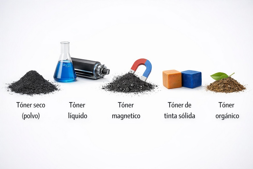 Esta clasificación es más amplia y se usa para describir cómo se presenta el tóner (polvo, líquido, sólido) o qué propiedades especiales tiene.